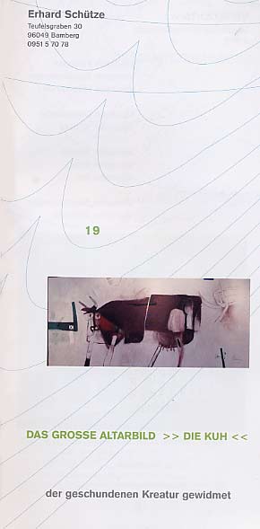 Erhard Schütze zeigt ein sehr großes Bild auf Leinwand. „Ich widmete es dem geschundenen Rind, das in apokalyptischem Spektakel  ob krank oder gesund  gekeult wurde.“