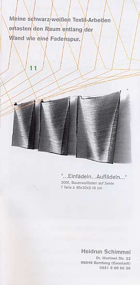 | Leichte, schwarz-weiße Textil-Arbeiten umfassen den(selben) Raum wie eine Fadenspur. Die Serie ...einfädeln...auffädeln... befasst sich mit der Instabilität des textilen Materials, seiner Abhängigkeit von einer haltgebenden Fixierung und dadurch mit seiner Beziehung zum menschlichen Leben. Die einzelnen Teile finden durch das Auffädeln ihre Form, sie pendeln zwischen Zwei- und Dreidimensionalität, sie reagieren mit leichter Bewegung auf vorübergehende Betrachter. | ||||||