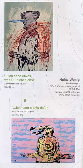 | „...meine Bilder (Acryl/Papier): - Vogelmensch - Frau -...ich kann nichts dafür - Der Seher - ...bläst in sein Horn - Reigen - Zwei Köpfe  Begegnung - Mann mit roter Zunge - Schattenspiele - Puppenspiele - Von der Angst zu lachen - Mann mit erhobenen Armen - Vogel -“ | |||||||