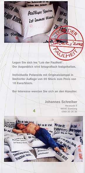 | Sommer 2002 24 Einzelkissen unterschiedlicher Größe. „Legen Sie sich ins ‚Lob der Faulheit’. Der Augenblick wird fotografisch festgehalten. Individuelle Polaroids mit Originalstempel in limitierter Auflage von 20 Stück zum Preis von 10,00 Euro/Stück bei Interesse wenden Sie sich an den Künstler“ | |||||||