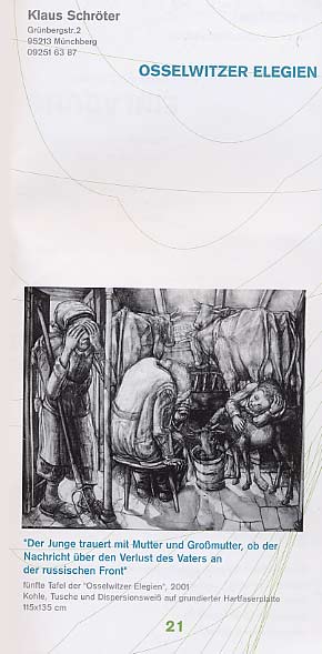 | Grafischer Zyklus zu dem Thema  >Osselwitzer Elegien< Auf großformatigen Bildtafeln werden Kindheitserlebnisse des Zeichners thematisiert, die ihn nachhaltig geprägt haben. Die Bilder basieren auf Texten des Zeichners... Bildtitel:  - Der Junge sieht die Folterung eines russischen     Zwangsarbeiters durch die Bauern des Dorfes.  - Die große Ratte flieht zuerst über die Schulter des    Jungen und erschreckt ihn zutiefst. - Der Junge trauert mit Mutter und Großmutter, ob     der Nachricht über den Verlust des Vaters an der     russischen Front. - Die geliebte Großmutter bleibt während der großen    Flucht allein auf der grauen Straße zurück.  | |||||||