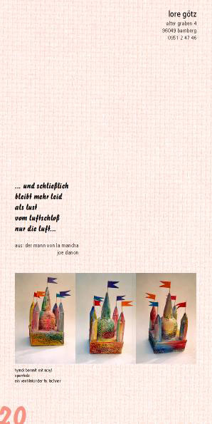 Lore Götz  bisher ohne eigenes Haus- baut eins: aus bemalter Ballonseide, mit vier Ecktürmen und einem Mittelturm mit Kuppel. Mit 2,20 m in der Höhe wird es reichen für den Beginn einer Märchenstunde, aber nur wenn die Puste hält.
