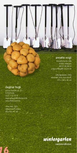 | Wintergarten Annette Voigt und Dagmar Hugk untersuchen künstlerisch, nicht wirklichkeitsgetreu, das Phänomen Wintergarten. Ein Wintergarten ist ein Reservoir für Pflanzen, die unter unseren klimatischen Bedingungen nicht wachsen würden. Er bildet einen Schutzraum; hier findet das Exotische Eingang in die Wohnstätte. Er ist künstlicher als der Hausgarten... Die Nutzung des Wintergartens vermittelt als räumliche Fortsetzung der Wohnstätte Annehmlichkeit: er bietet den Luxus, ganzjährig im Grünen zu sitzen und prägt damit das Wohngefühl in entscheidender Weise...