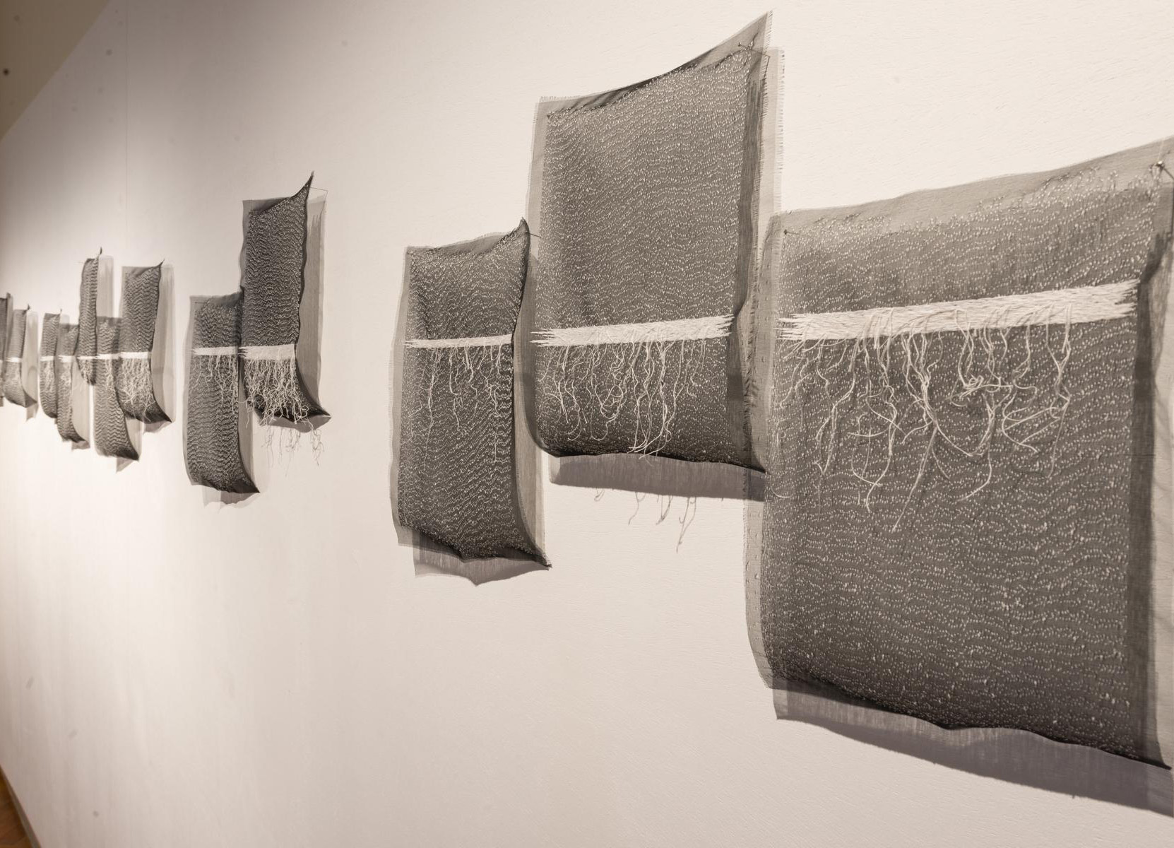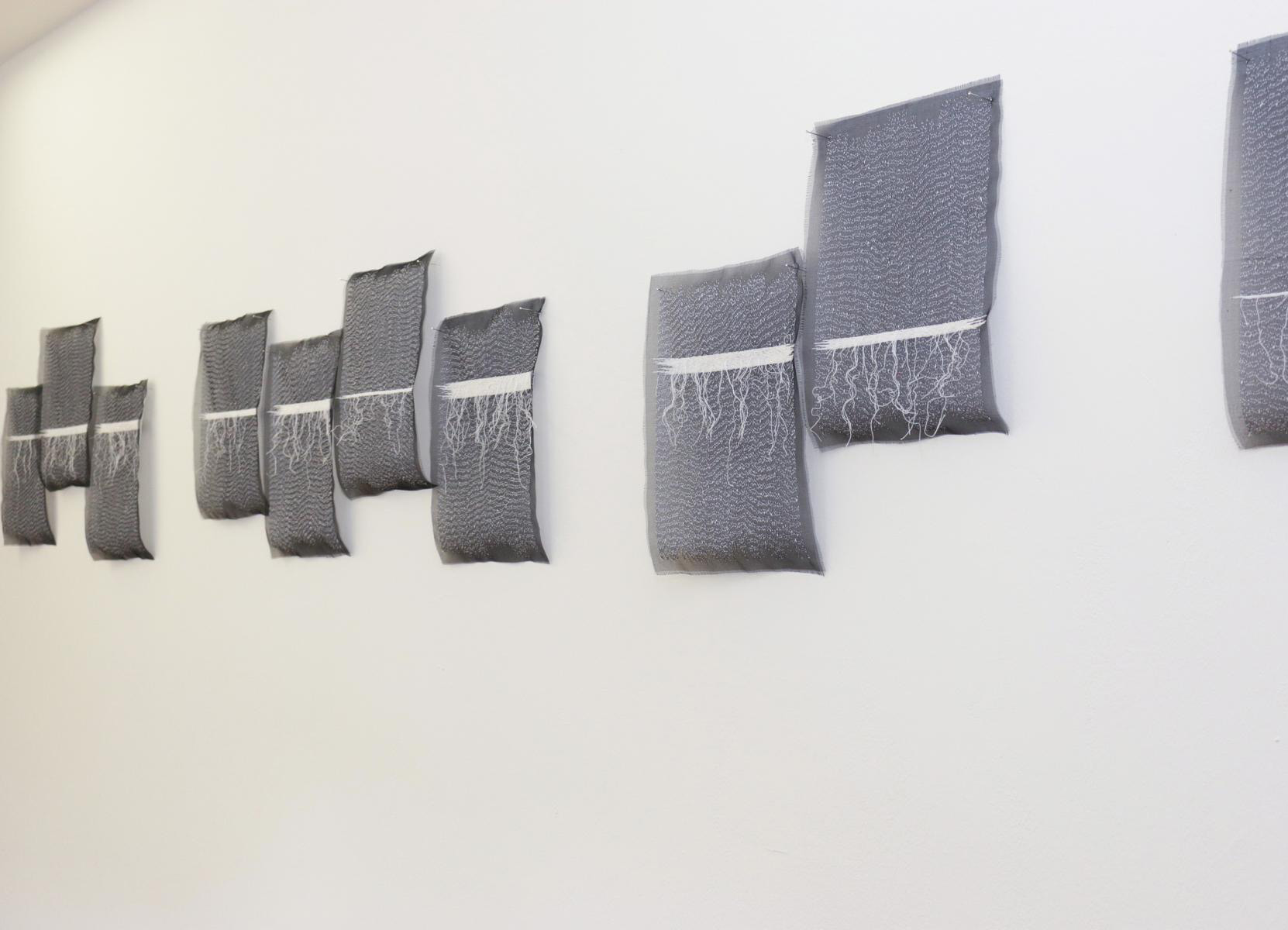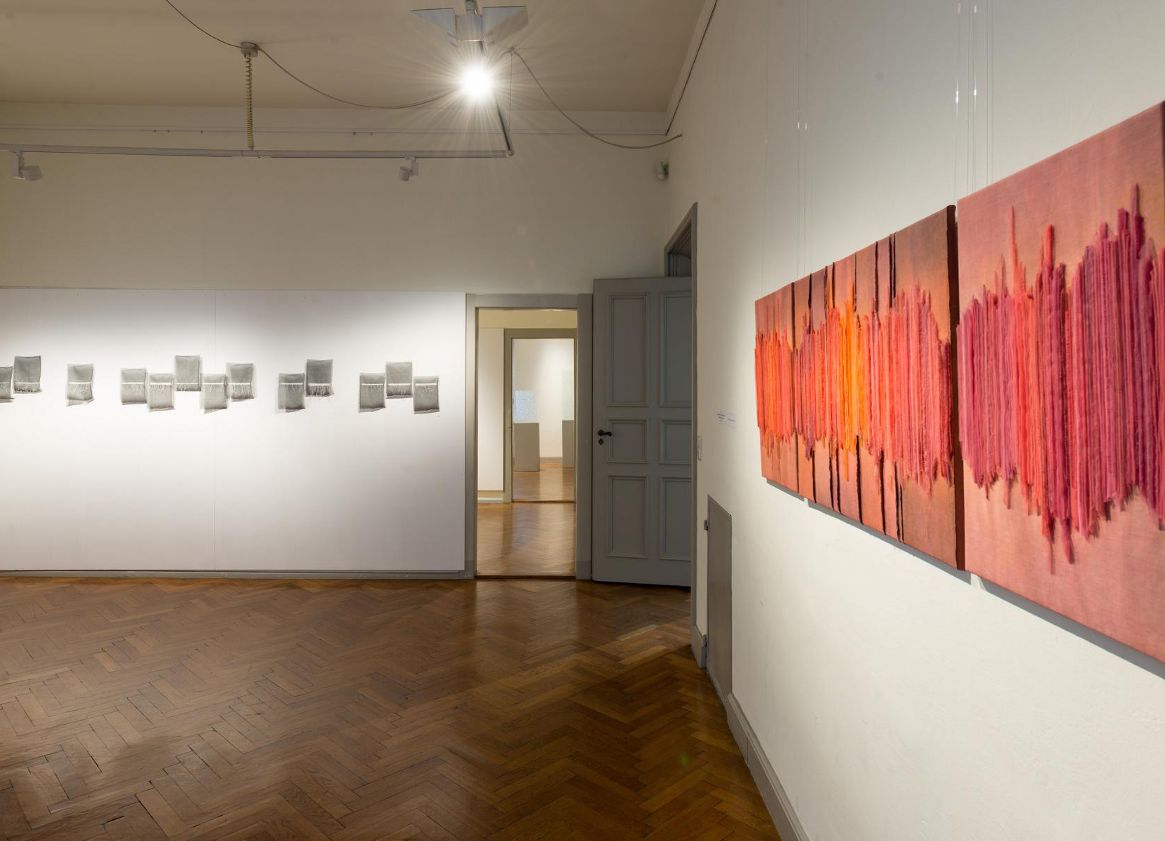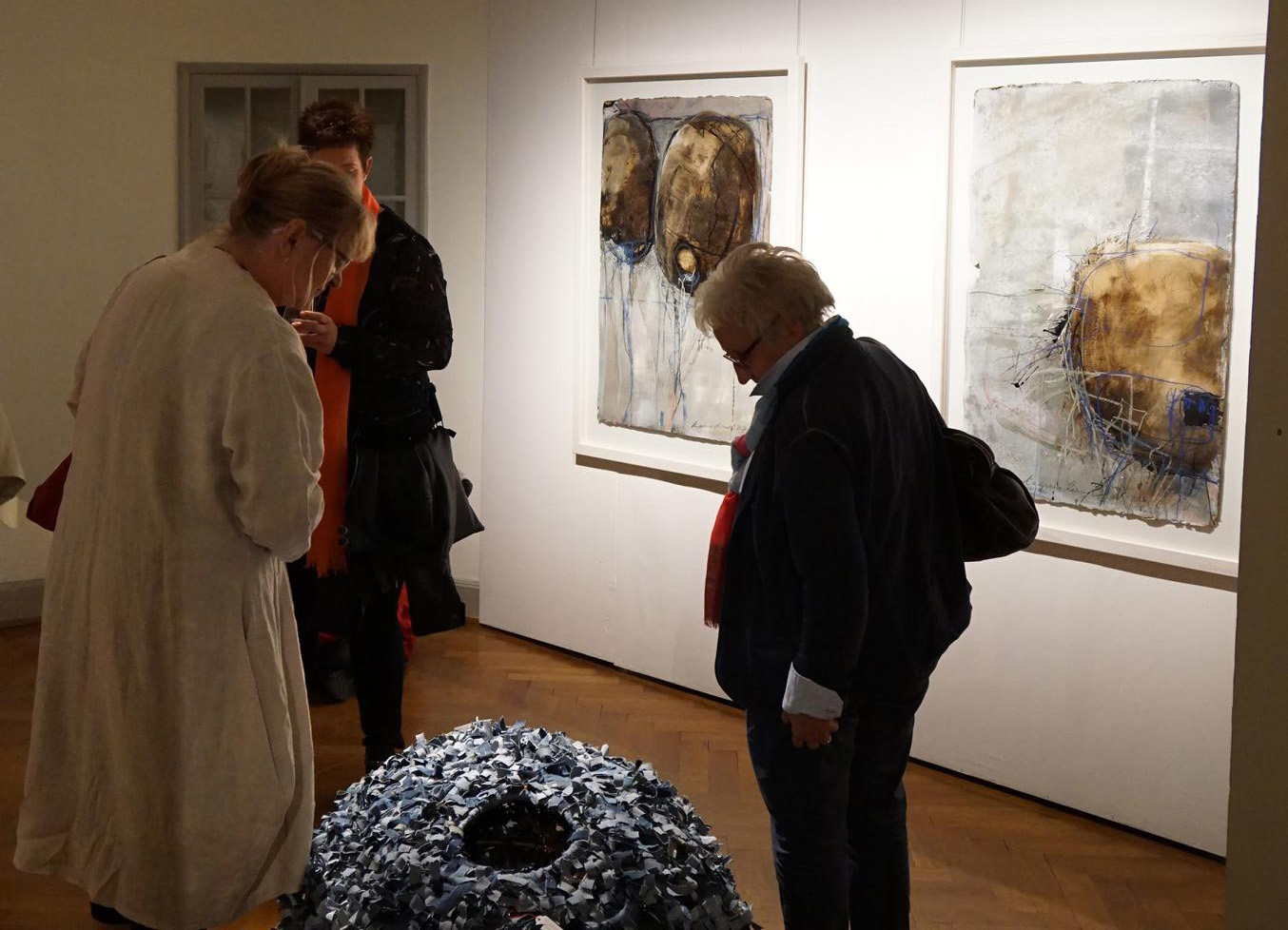 Drei Künstlerinnen arbeiten mit den verwandten Materialien Faden, Gewebe, Papier. Verbindungen werden in einer gesamträumlichen Lösung neu formuliert