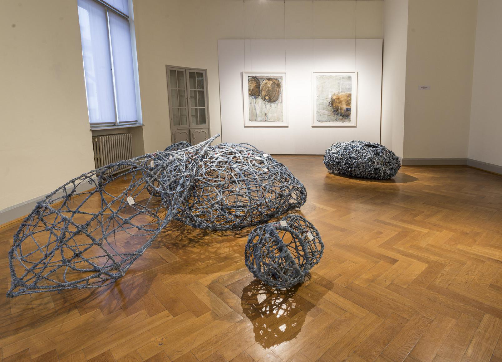 Weidenkörbe in verschiedenen Größen und unterschiedlichen organischen Formen: Die Weidenäste bilden ein festes Geflecht. Innen- und Außenräume sind durch eine Öffnung miteinander verbunden. Das Geflecht ist mit Jeansstoff ummantelt, der von getragenen Hosen unterschiedlicher Personen aus Buttenheim, dem Geburtsort Levi Strauss´, stammt. Schilderüber die genaue Herkunft der Personen befinden sich an den Objekten. Die Objekte liegen wie Kokons im Raum.