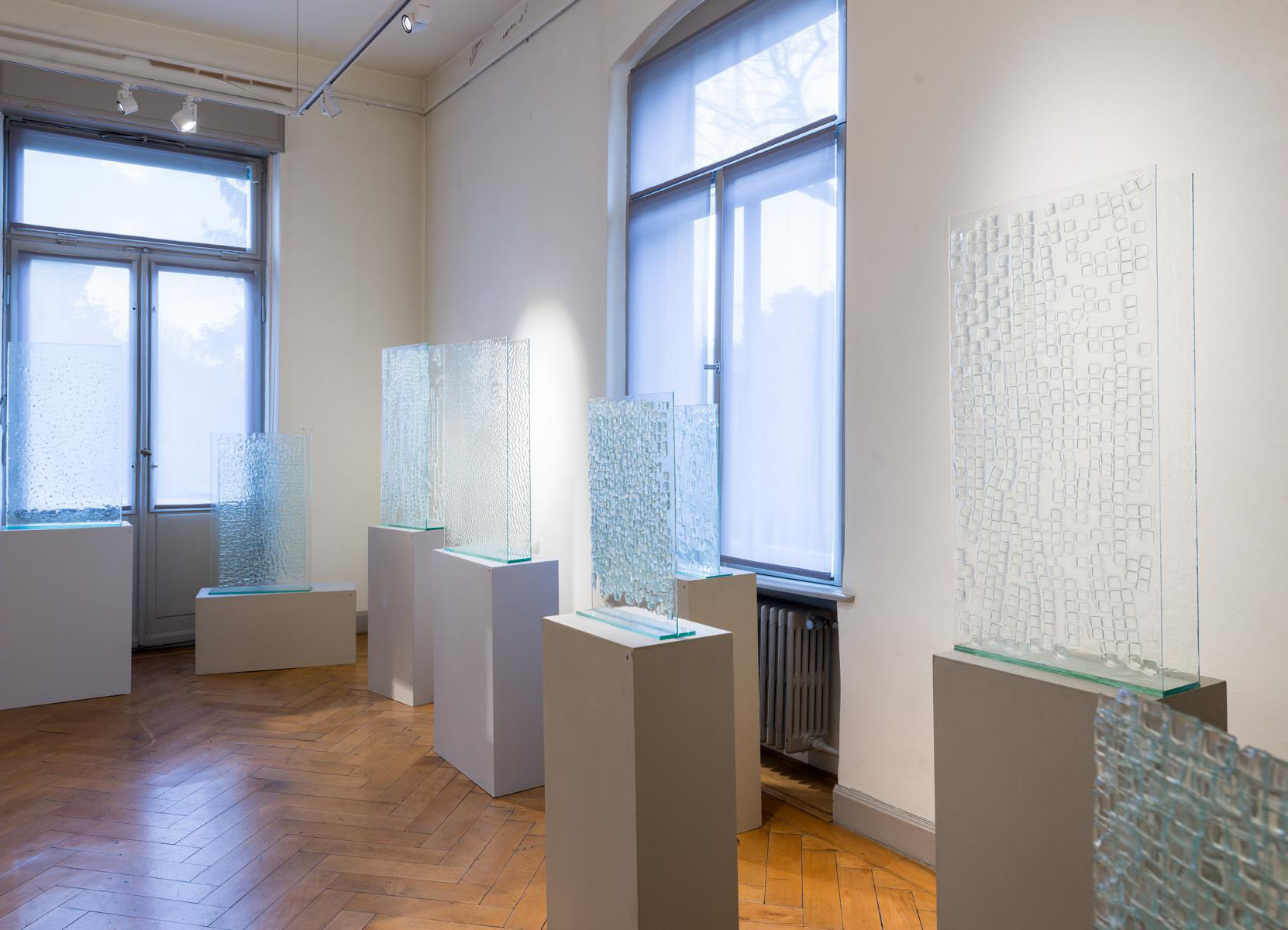 Die Werkreihe besteht aus Industriegläsern, farblos und transparent, im Brennofen verformt durch Manipulation des Untergrundes und des Glasaufbaus. Durch den Schmelzvorgang, die Länge und die Höhe der Ofeneinwirkung verändern sich Rückseite und Vorderseite. Auf den Oberflächen reflektiert das Licht und macht die innewohnende Verwerfung sichtbar, gleich einer Glaskugel, in der ich mich selbst sehe und das Dahinter, den Raum, das Licht. Die Entwicklung dieser Reihung hat einen experimentellen Charakter, da viele Parameter auf das Ergebnis einwirken und die weitere Vorgehensweise beeinflussen. Das prozesshafte Herangehen birgt den Reiz des Entdeckens, verbunden mit der Gefahr des Scheiterns, der Umwege und Irrwege. Nicht immer ist der gerade Weg der Richtige. Der Titel Take me to the moon soll diese Unwägbarkeit widerspiegeln, eine Reise ins Ungewisse, das Risiko des Gehens neuer Wege. Der Mond als Titelgeber ist Synonym für das Wesen dieser Glasindividuen. Der "bleiche Geselle" sendet kein eigenes Licht aus, sondern reflektiert, ist unfarbig und lebt durch das Licht. Er ist eine Folie für Träume, Interpretationen und Gedanken. Reflektion braucht immer ein Gegenüber.
