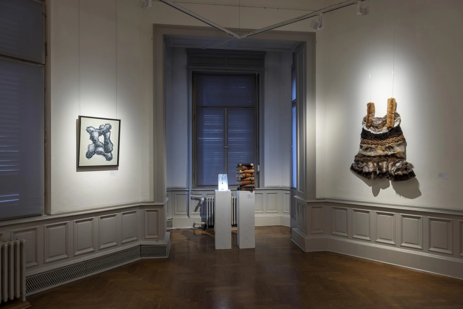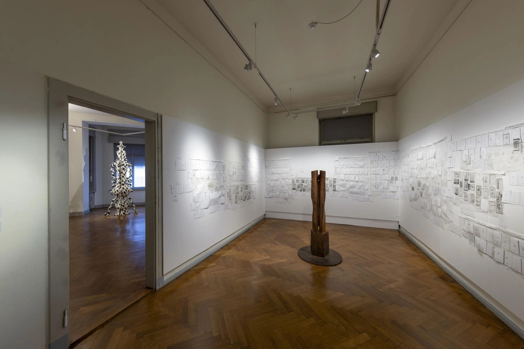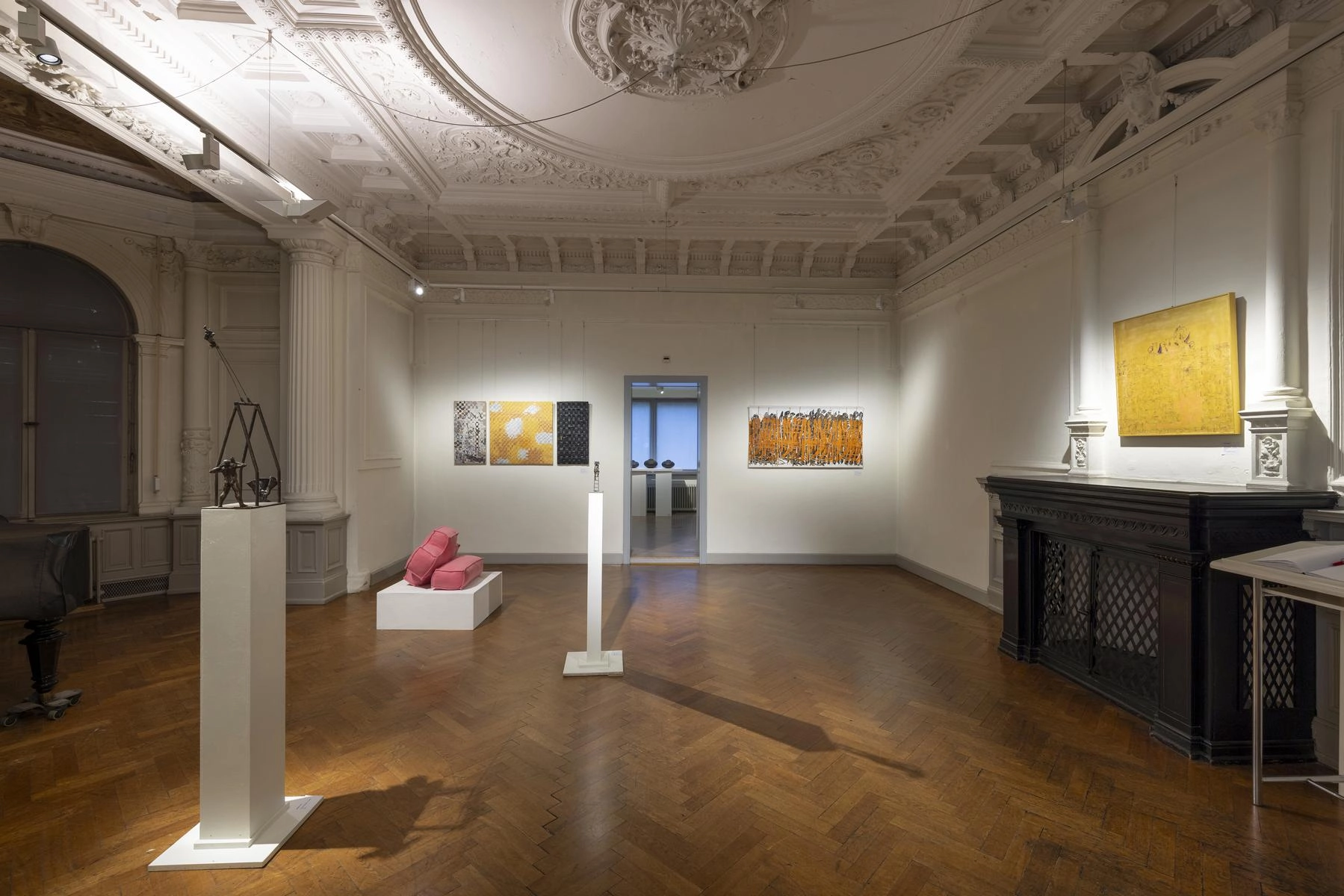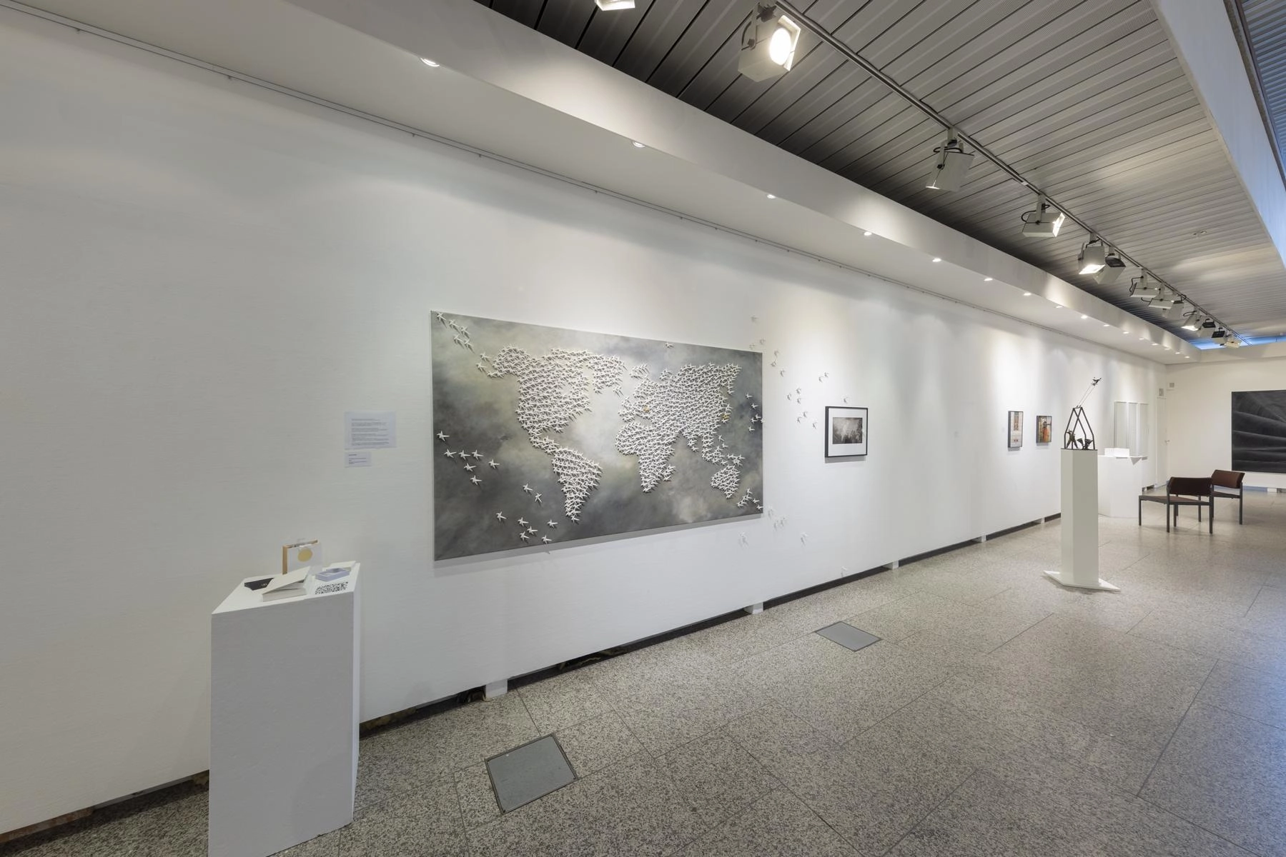 Riesige zerknüllte Zeichnungen quellen aus den Türen eines Raumes und versperren den Zugang zur Präsentation von Henrike Franz´ produktiver Zeichenarbeit. Aus Pelzkrägen - ehemals Zeichen von Luxus - formt Christa Hoppe die Idealform eines Kleides. 600 Zeichnungen aus dem "Kronach Korpus" von Hubert Sowa umgeben als Universum eine aus einem Stamm geschnitzte Skulptur von Fritz Hermann. Göttergleich ziehen nach Macht und Geld strebende Autokraten über einen Fries von Franziska Erb-Bibo. Ein Datum, von Johanna Galefske eingearbeitet in ein Metallrelief, gemahnt an den Tag im Jahr, an dem die verbrauchten Ressourcen deren natürliche Regeneration übersteigen. Machthungrige von Moriskentänzern inspirierte Wesen aus Mensch und Tier vereint Ulla Reiter zu einem surrealen Tanz im Dickicht der politischen Entwicklungen. Auf Verschwendung und übermäßigen Konsum weisen die Buntstiftzeichnungen von Katharina Heubner hin. Was ist wesentlich? Mit dieser Frage befassen sich die leisen Bilder von Gudrun Schüler und bilden einen Gegensatz zu dem Lauten, das in unserer Gesellschaft überhandzunehmen scheint. Adelbert Heil geht das Thema figürlich an: immer höher und weiter steigt seine Figur auf einer Leiter und steigt letztlich durch eine Öffnung ins Ungewisse.