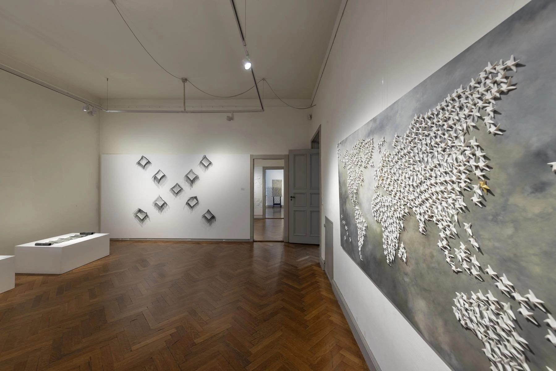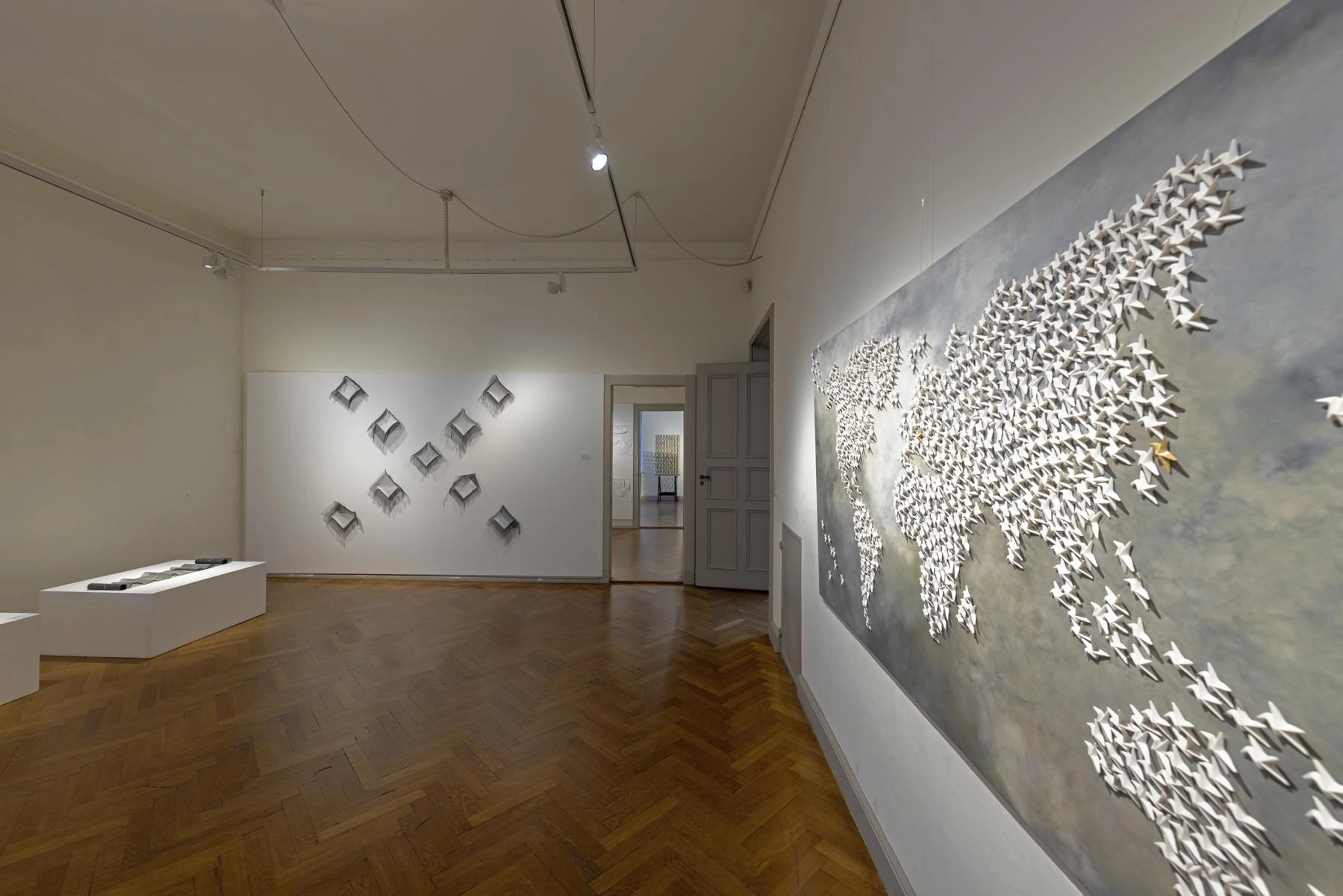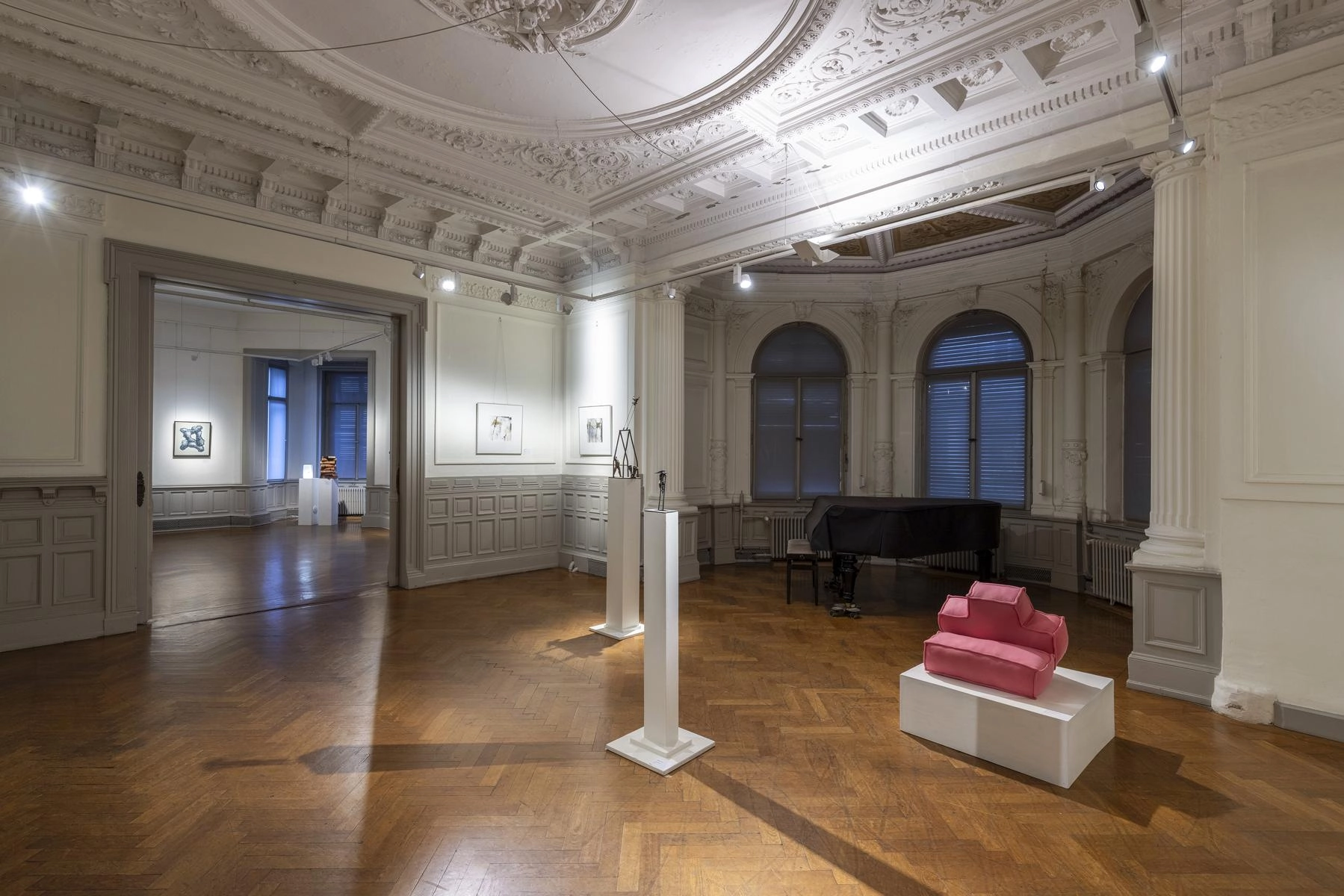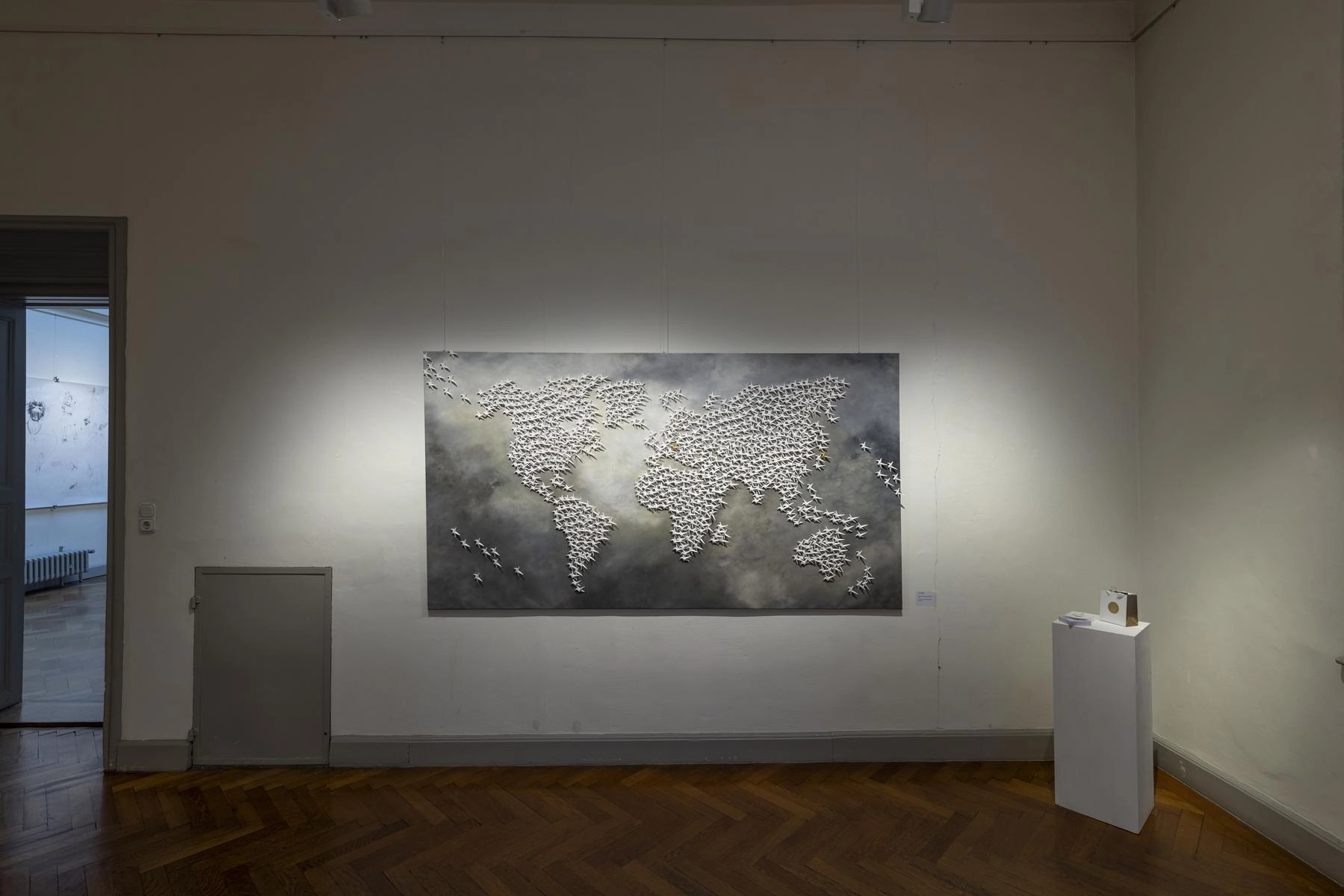 Riesige zerknüllte Zeichnungen quellen aus den Türen eines Raumes und versperren den Zugang zur Präsentation von Henrike Franz´ produktiver Zeichenarbeit. Aus Pelzkrägen - ehemals Zeichen von Luxus - formt Christa Hoppe die Idealform eines Kleides. 600 Zeichnungen aus dem "Kronach Korpus" von Hubert Sowa umgeben als Universum eine aus einem Stamm geschnitzte Skulptur von Fritz Hermann. Göttergleich ziehen nach Macht und Geld strebende Autokraten über einen Fries von Franziska Erb-Bibo. Ein Datum, von Johanna Galefske eingearbeitet in ein Metallrelief, gemahnt an den Tag im Jahr, an dem die verbrauchten Ressourcen deren natürliche Regeneration übersteigen. Machthungrige von Moriskentänzern inspirierte Wesen aus Mensch und Tier vereint Ulla Reiter zu einem surrealen Tanz im Dickicht der politischen Entwicklungen. Auf Verschwendung und übermäßigen Konsum weisen die Buntstiftzeichnungen von Katharina Heubner hin. Was ist wesentlich? Mit dieser Frage befassen sich die leisen Bilder von Gudrun Schüler und bilden einen Gegensatz zu dem Lauten, das in unserer Gesellschaft überhandzunehmen scheint. Adelbert Heil geht das Thema figürlich an: immer höher und weiter steigt seine Figur auf einer Leiter und steigt letztlich durch eine Öffnung ins Ungewisse.