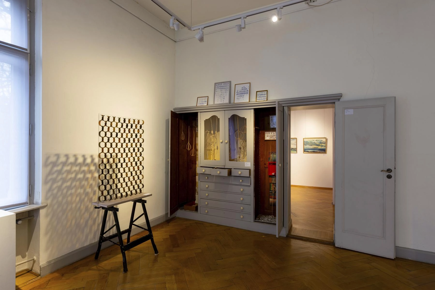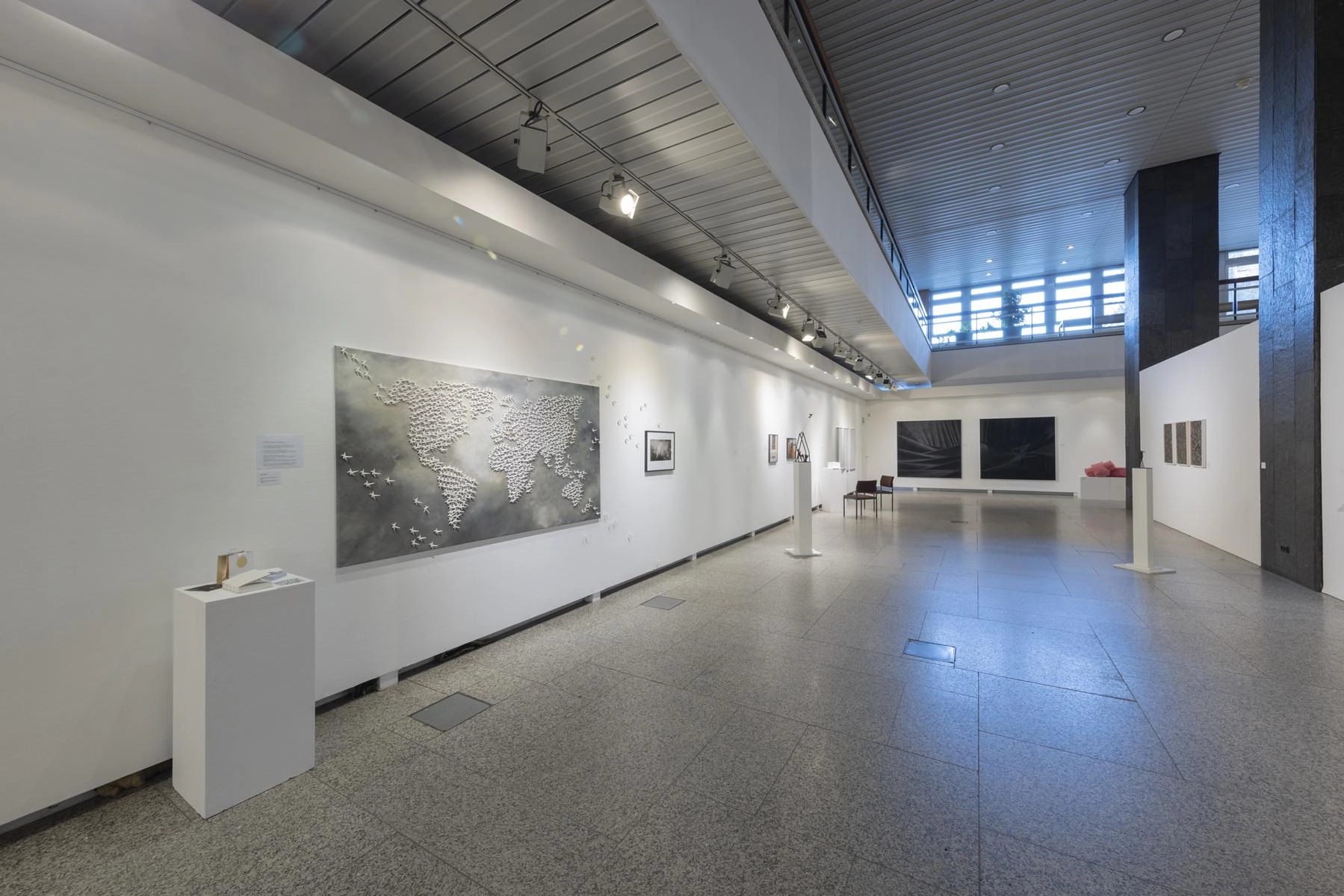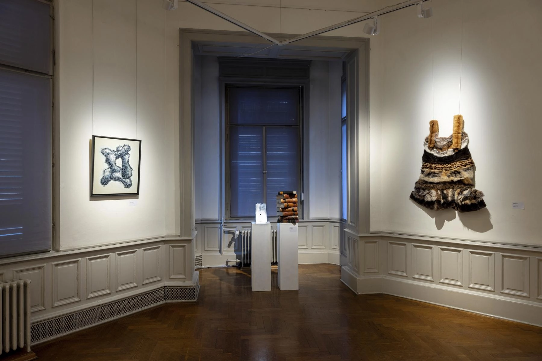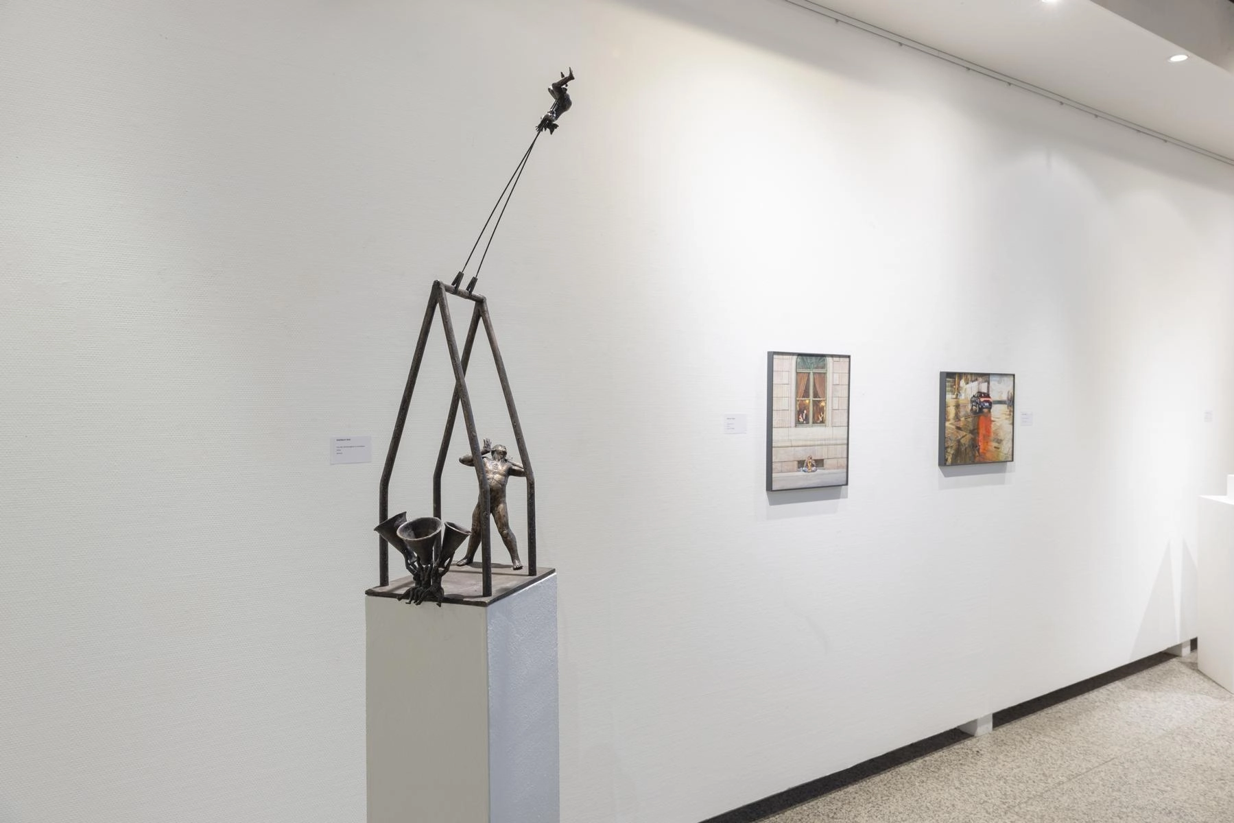 Riesige zerknüllte Zeichnungen quellen aus den Türen eines Raumes und versperren den Zugang zur Präsentation von Henrike Franz´ produktiver Zeichenarbeit. Aus Pelzkrägen - ehemals Zeichen von Luxus - formt Christa Hoppe die Idealform eines Kleides. 600 Zeichnungen aus dem "Kronach Korpus" von Hubert Sowa umgeben als Universum eine aus einem Stamm geschnitzte Skulptur von Fritz Hermann. Göttergleich ziehen nach Macht und Geld strebende Autokraten über einen Fries von Franziska Erb-Bibo. Ein Datum, von Johanna Galefske eingearbeitet in ein Metallrelief, gemahnt an den Tag im Jahr, an dem die verbrauchten Ressourcen deren natürliche Regeneration übersteigen. Machthungrige von Moriskentänzern inspirierte Wesen aus Mensch und Tier vereint Ulla Reiter zu einem surrealen Tanz im Dickicht der politischen Entwicklungen. Auf Verschwendung und übermäßigen Konsum weisen die Buntstiftzeichnungen von Katharina Heubner hin. Was ist wesentlich? Mit dieser Frage befassen sich die leisen Bilder von Gudrun Schüler und bilden einen Gegensatz zu dem Lauten, das in unserer Gesellschaft überhandzunehmen scheint. Adelbert Heil geht das Thema figürlich an: immer höher und weiter steigt seine Figur auf einer Leiter und steigt letztlich durch eine Öffnung ins Ungewisse.