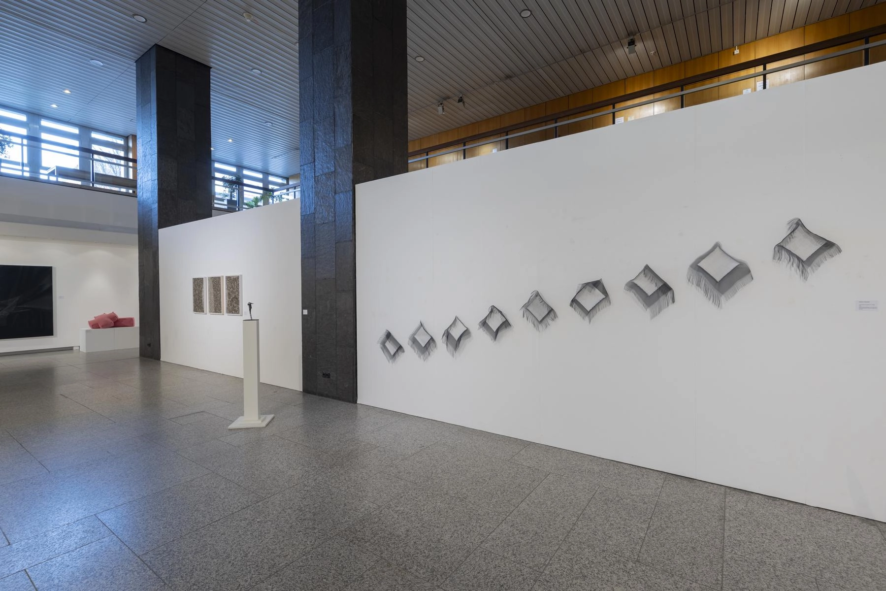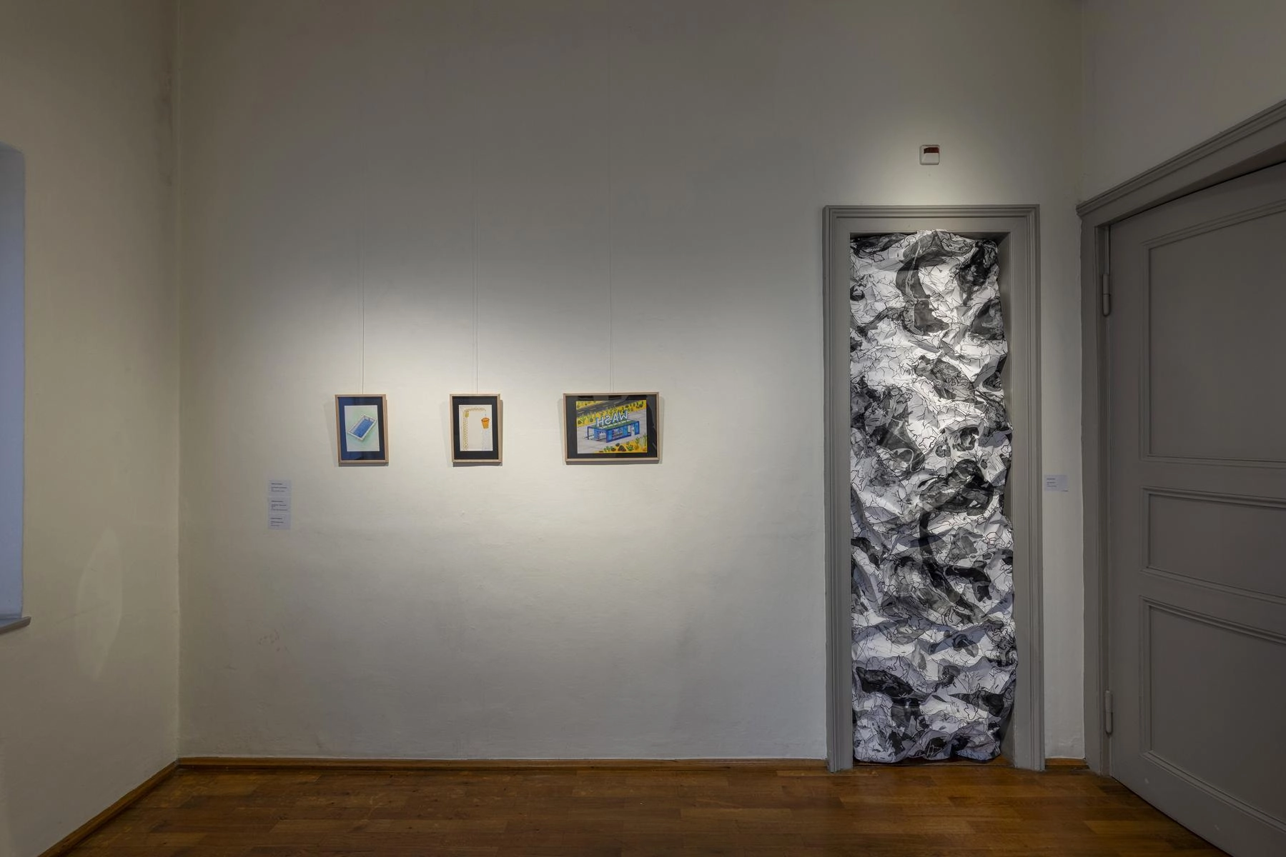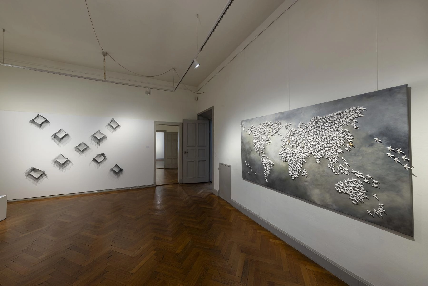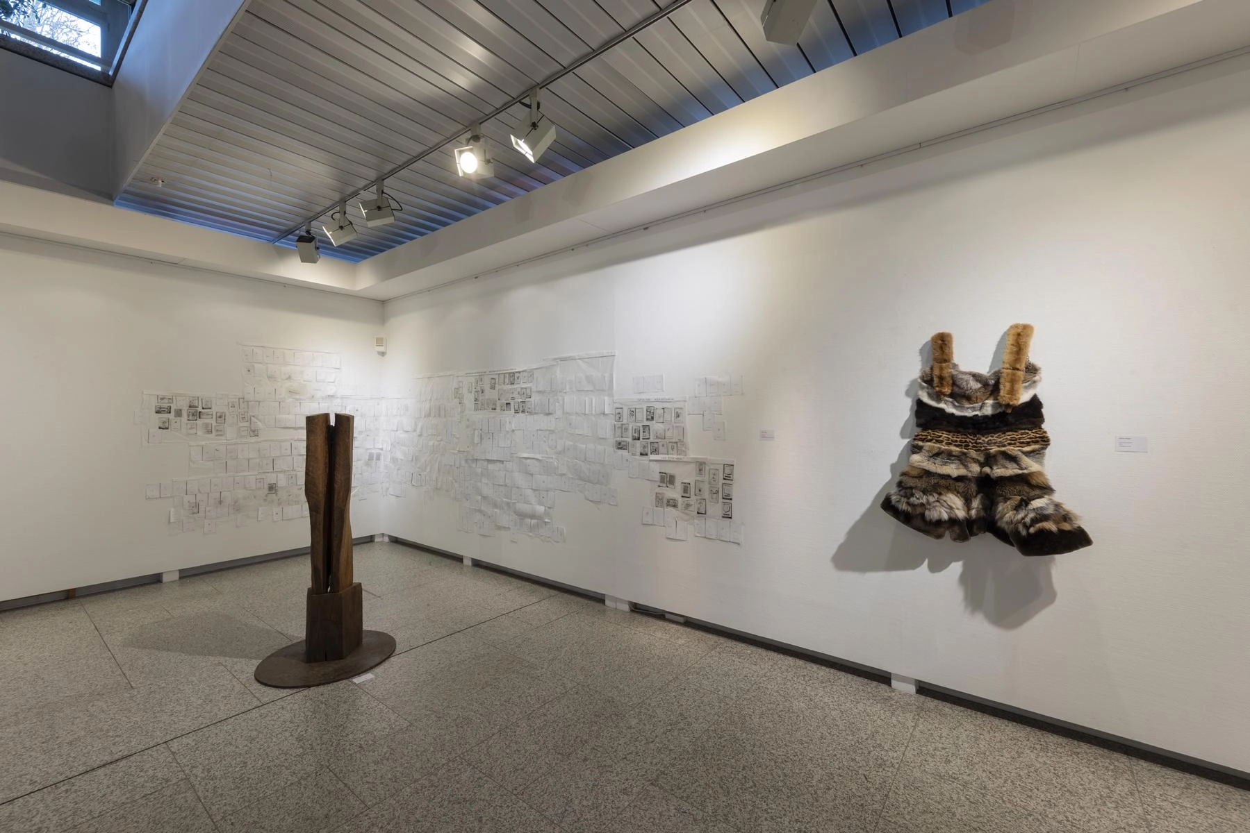 Riesige zerknüllte Zeichnungen quellen aus den Türen eines Raumes und versperren den Zugang zur Präsentation von Henrike Franz´ produktiver Zeichenarbeit. Aus Pelzkrägen - ehemals Zeichen von Luxus - formt Christa Hoppe die Idealform eines Kleides. 600 Zeichnungen aus dem "Kronach Korpus" von Hubert Sowa umgeben als Universum eine aus einem Stamm geschnitzte Skulptur von Fritz Hermann. Göttergleich ziehen nach Macht und Geld strebende Autokraten über einen Fries von Franziska Erb-Bibo. Ein Datum, von Johanna Galefske eingearbeitet in ein Metallrelief, gemahnt an den Tag im Jahr, an dem die verbrauchten Ressourcen deren natürliche Regeneration übersteigen. Machthungrige von Moriskentänzern inspirierte Wesen aus Mensch und Tier vereint Ulla Reiter zu einem surrealen Tanz im Dickicht der politischen Entwicklungen. Auf Verschwendung und übermäßigen Konsum weisen die Buntstiftzeichnungen von Katharina Heubner hin. Was ist wesentlich? Mit dieser Frage befassen sich die leisen Bilder von Gudrun Schüler und bilden einen Gegensatz zu dem Lauten, das in unserer Gesellschaft überhandzunehmen scheint. Adelbert Heil geht das Thema figürlich an: immer höher und weiter steigt seine Figur auf einer Leiter und steigt letztlich durch eine Öffnung ins Ungewisse.